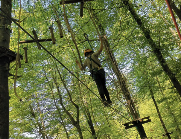 Ponts de singe, ponts tibétains, saut de Tarzan, filets acrobatiques, étriers, poutres d'équilibre, tyroliennes et autres sensations sont au programme !